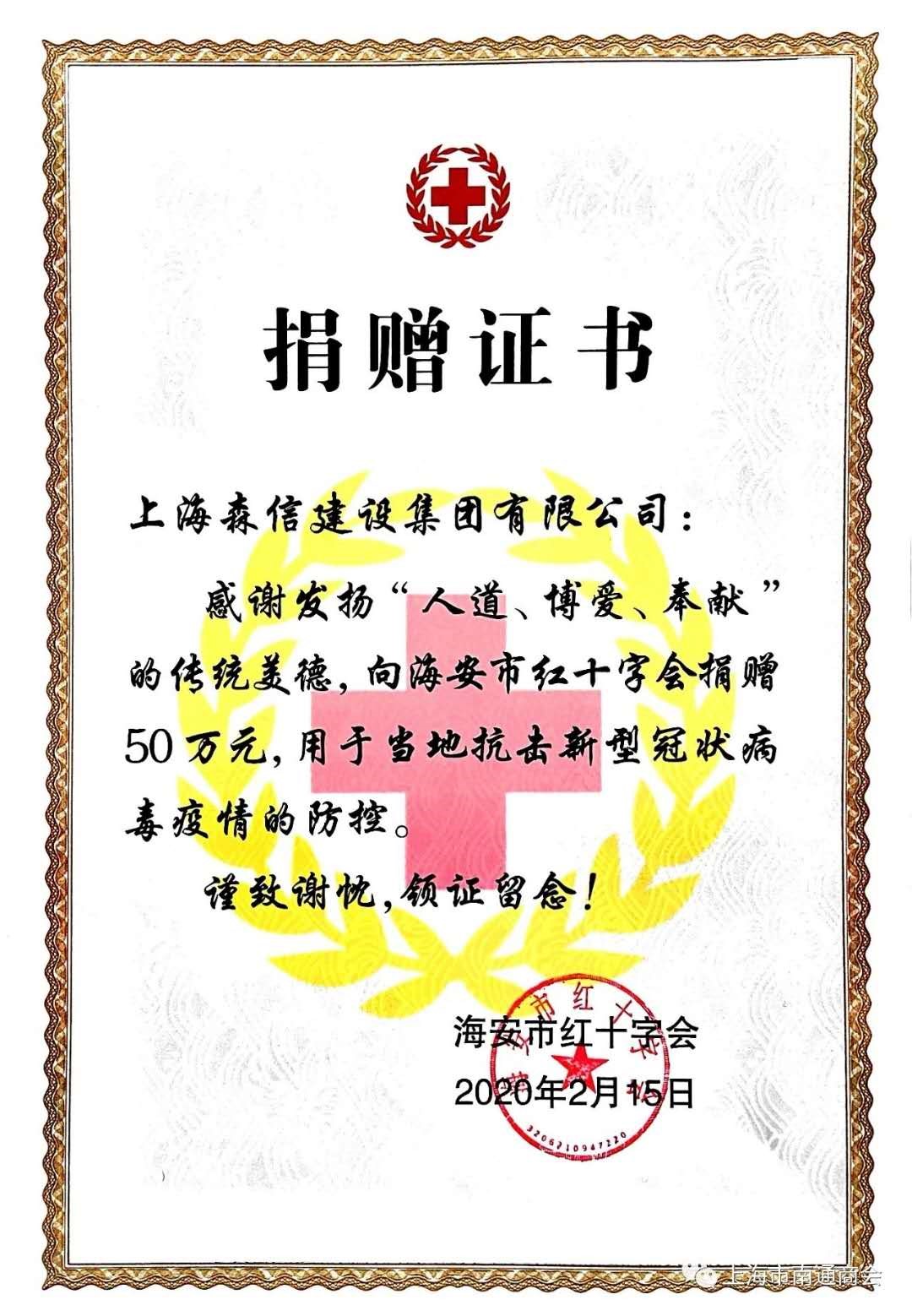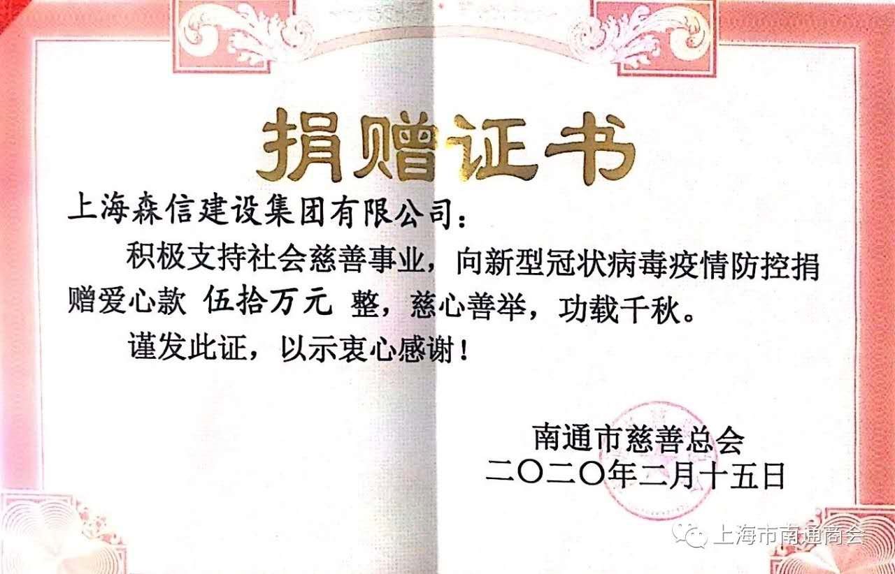 虹口區(qū)工商聯(lián)(總商會)主席(會長)、森信投資控股(集團)有限公司董事長、上海市南通商會會長王文其通過虹口區(qū)光彩事業(yè)促進會、上海覺群文教資金會、南通市慈善總會、南通市海安市紅十字會捐款200多萬元,為武漢及武漢周邊疫情嚴(yán)重地區(qū)提供防護、消毒及生活物資;并向上海市青少年發(fā)展基金會捐款1萬元。他表示,森信將密切關(guān)注疫情的變化,以實際行動落實社會責(zé)任,帶動各行各業(yè)眾志成城、同舟共濟,全力抓好疫情防控,有序推進復(fù)工復(fù)產(chǎn)。