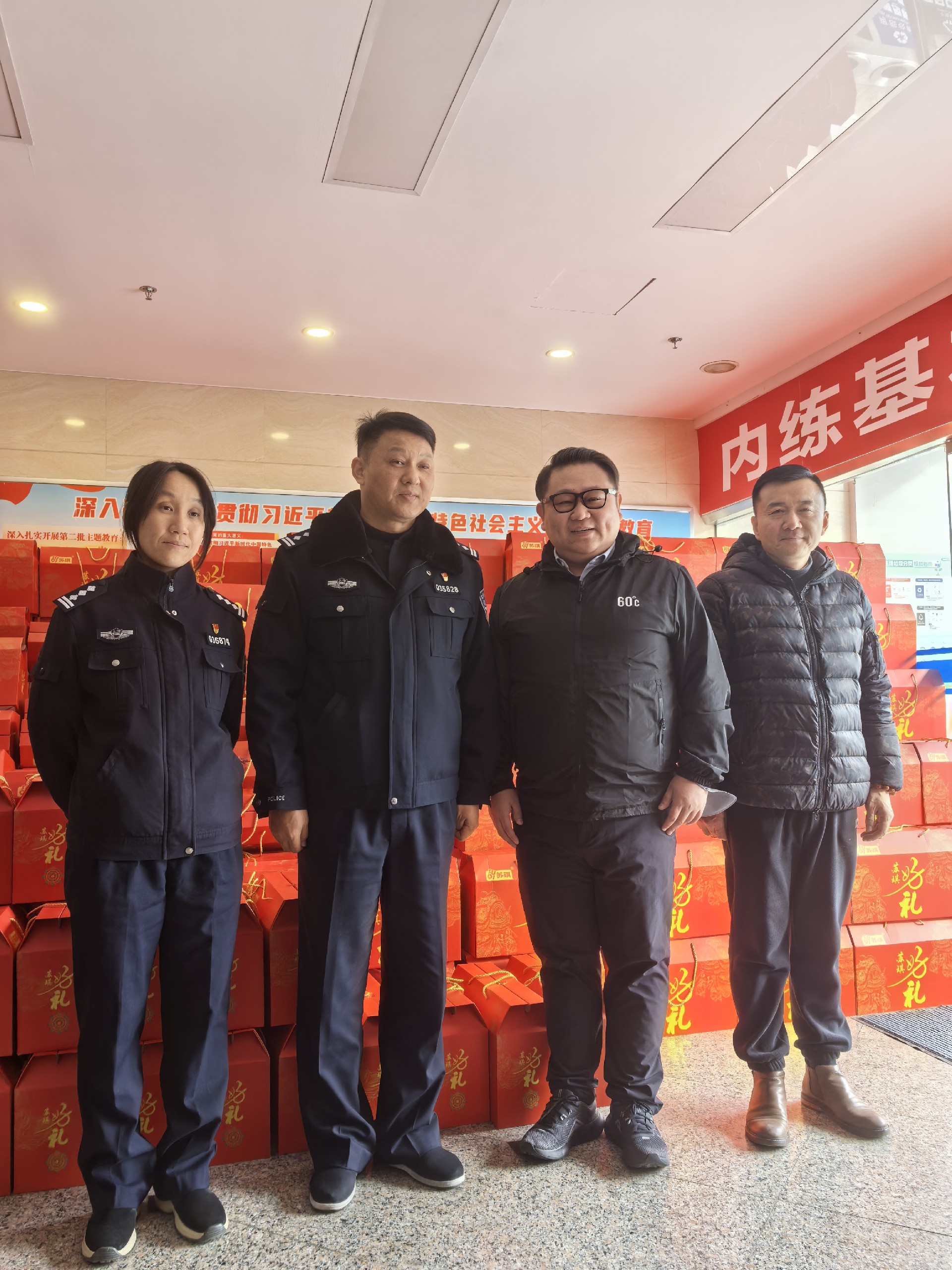 在慰問現(xiàn)場(chǎng),王銘豪總裁與接待人員熱情握手、親切交談,詳細(xì)了解他們的工作、生活情況,對(duì)他們的辛勤付出表示衷心感謝,對(duì)他們“舍小家、為大家”,為群眾的平安幸福保駕護(hù)航表示崇高敬意,叮囑他們?cè)诤涞亩咀⒁夥篮E?,保重身體。